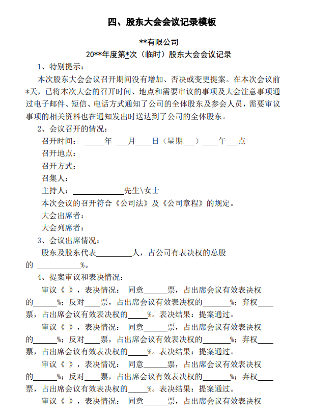 公司治理之“三會模板”系列——股東大會會議記錄模板